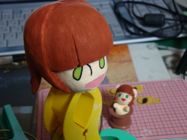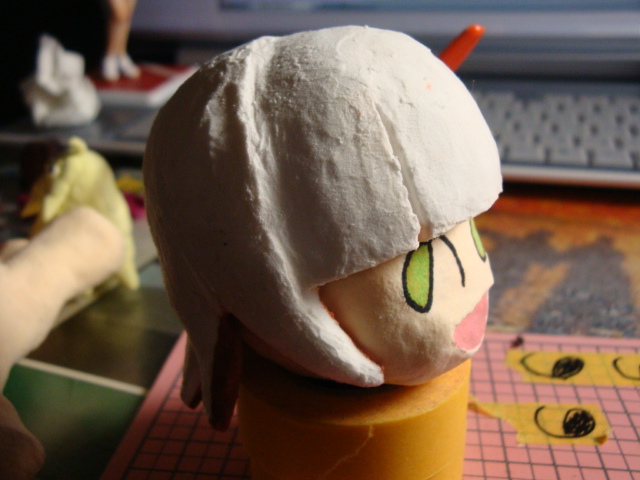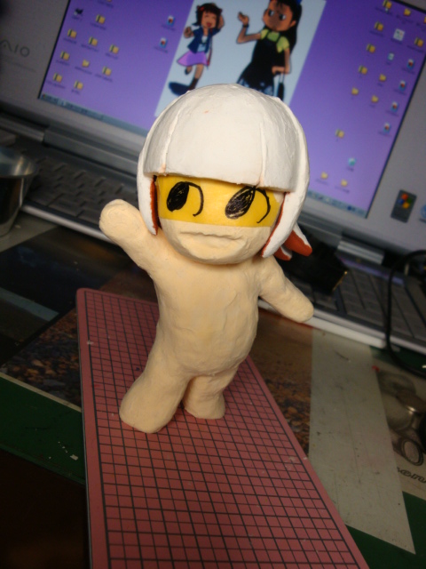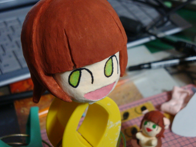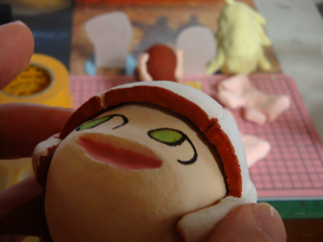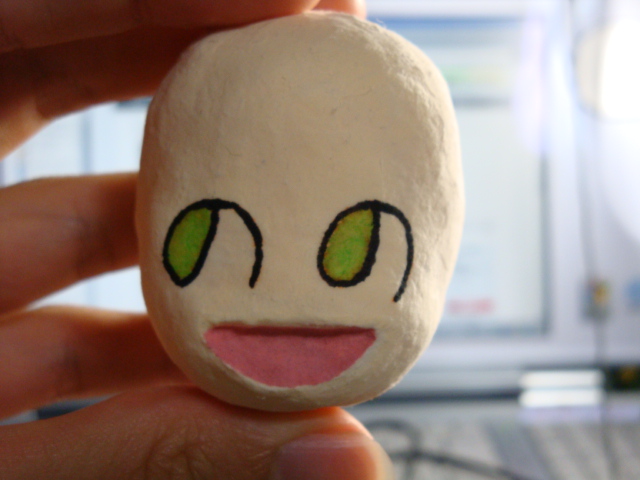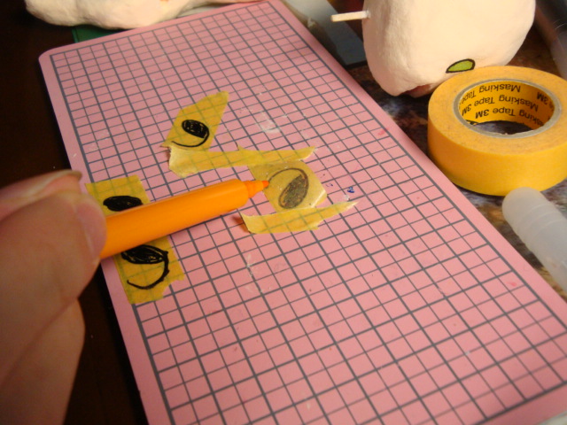 ののワさんの目を マスキングテープで、コピーしました。 最初は4Bの鉛筆の黒鉛で ぜんぜん黒鉛が残らなかったので 水生ペンで なぞってコピーさせました コレをネンドに張ると オレンジの線がのります 失敗したらちょっと大変w 油性ぺんでなぞって うすーーーくミドリを入れました あと、口も塗りましたw 顔ができるとわくわくするね